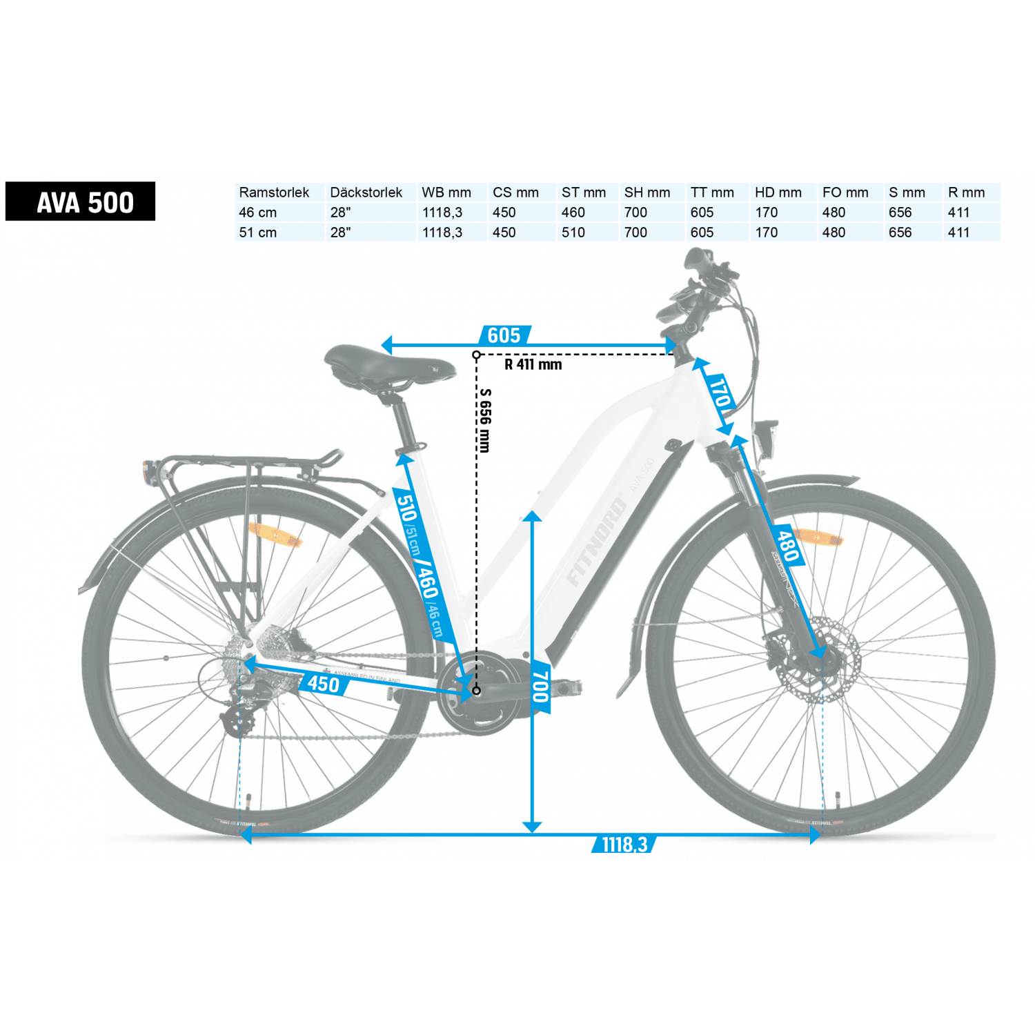 FitNord Ava 500 är elcykeln för dig som är ute efter en välutrustad brukscykel med 80 Nm stark mittmotor och lång räckvidd. Batteriets kapacitet är 612 Wh. Tack vare dämpad gaffel som kan låsas vid behov och effektiva hydrauliska skivbromsar tar du dig fram bekvämt och säkert. Ava 500 kan med fördel användas av flera i familjen eftersom ramen är av unisexmodell.