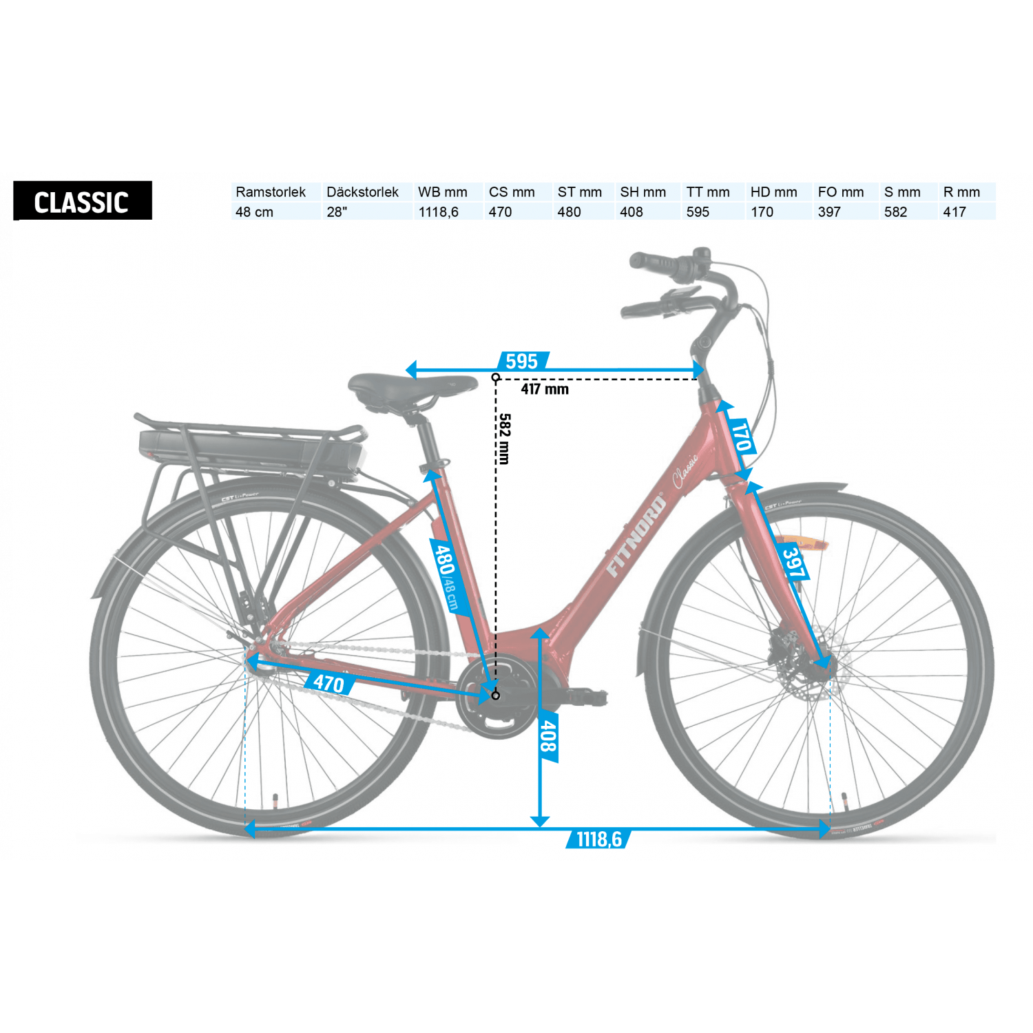 FitNord Classic 500 är en klassiskt designad elcykel med lågt insteg, avslappnad upprätt körposition och fotbroms. Elcykeln är utrustad med kraftfull men ändå mjukgående mittmonterad elmotor som ger god acceleration och gott om kraft i tunga motlut. Det stora batteriet gör det möjligt för att ge dig ut på långa cykelturer.